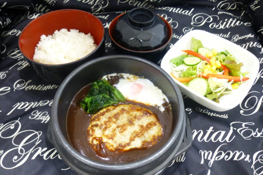 那須三元豚100%のハンバーグを特製デミグラスソースで煮込みました!やわらかポークのグリルステーキ 追加料金650円(税込)