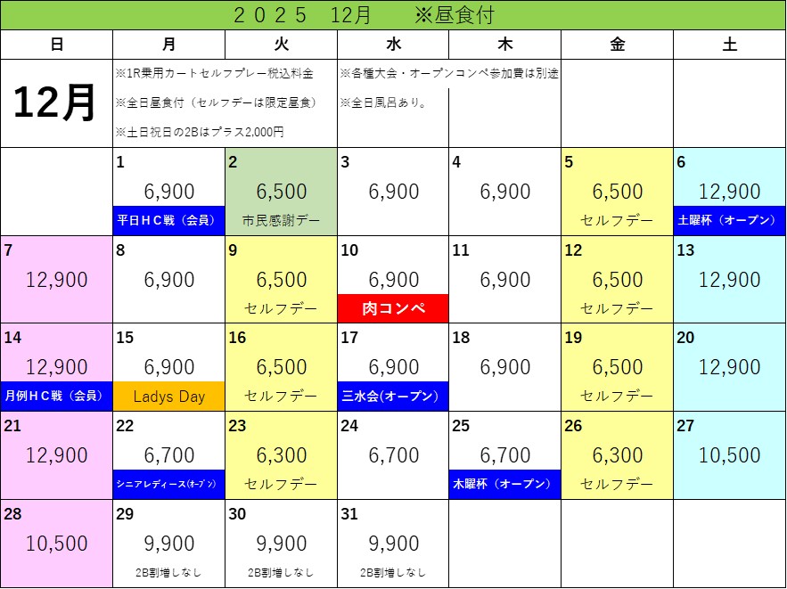日頃よりご来場いただきありがとうございます。2025年12月ゴルフプレー料金のご案内です